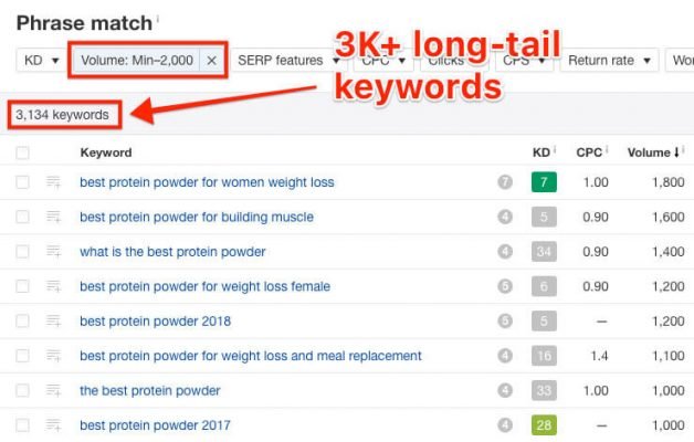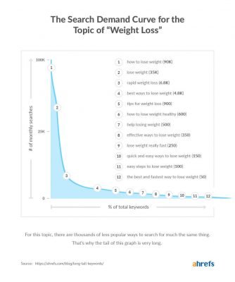 You can see that phrases with four and five words have significantly more search volume than the phrase with just two words “weight loss.”