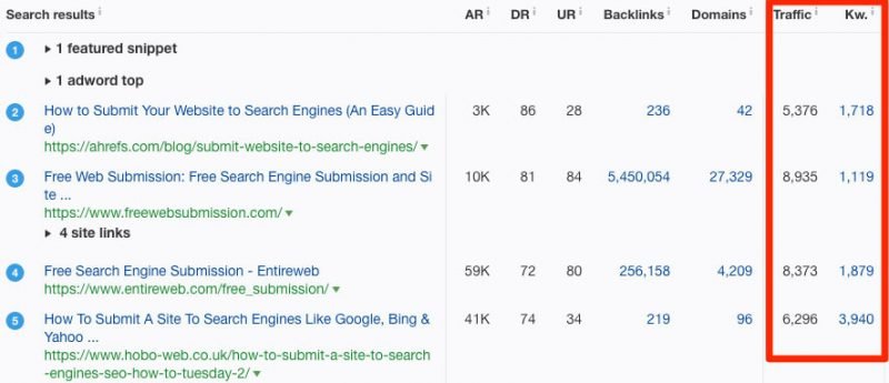 Note that pages ranking for the query “submit website to search engines” can receive 10 times more traffic than ranking for the query “SEO tips,” despite the latter having 3 times more search volume.