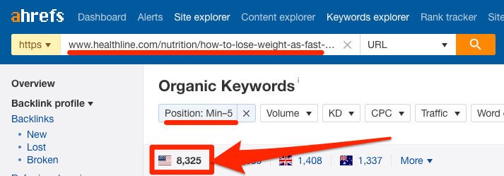 Then, we also checked the Organic Traffic report for this page in Ahrefs Site Explorer, and we could see that it ranks in the top 5 for over 8,000 RELATED keywords.