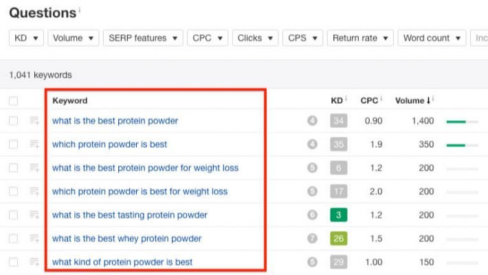 Another tip is to use the “Question” report in Ahrefs Keywords Explorer. These types of queries are very likely to be the “uncommon and specific” kind (meaning long-tail queries).