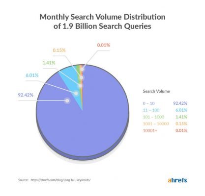 We analyzed ~1.9 BILLION keywords in the Ahrefs US database and found that 92.42% of them receive ten searches per month or fewer.