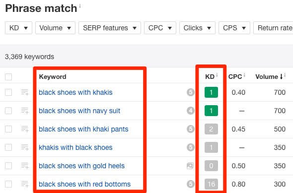 Consider this: if I enter “black shoes” into Ahrefs Keyword Explorer, then go to the Phrase match report and filter search queries containing the word “with”