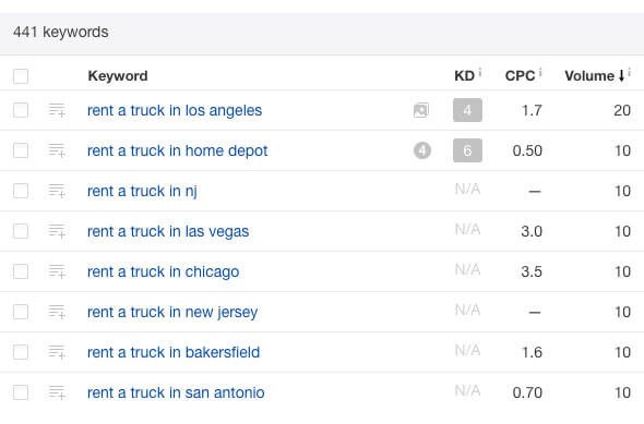 Let’s search online for the query “rent a truck in” with Ahrefs’ Keywords Explorer and go to the Phrase match report. This time, we get over 400 keywords, all with very long tails.
