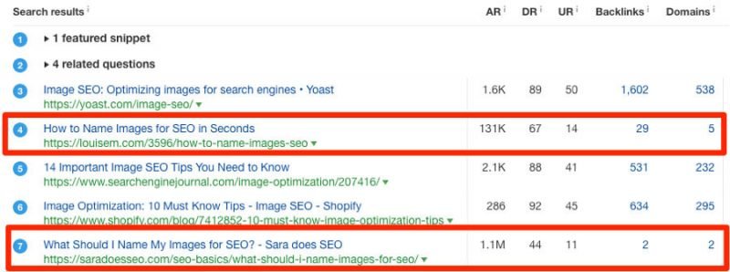 Let’s look at a few of the top-ranking pages for the long-tail keyword “how to name images for SEO” (80 searches/month).