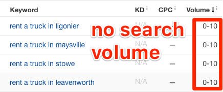 Of course, you have to do some work to set up a website with this number of pages, but probably much less work than ranking for “head” terms like “truck rental.”