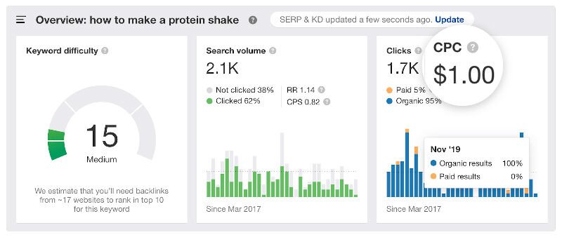 Based on the low “Keyword Difficulty” score for this query, if we assume the money spent is equivalent to the time and effort needed to invest in ranking organically, it’s almost certain that spending your time will cost less than paying to push your page to the top of search results.