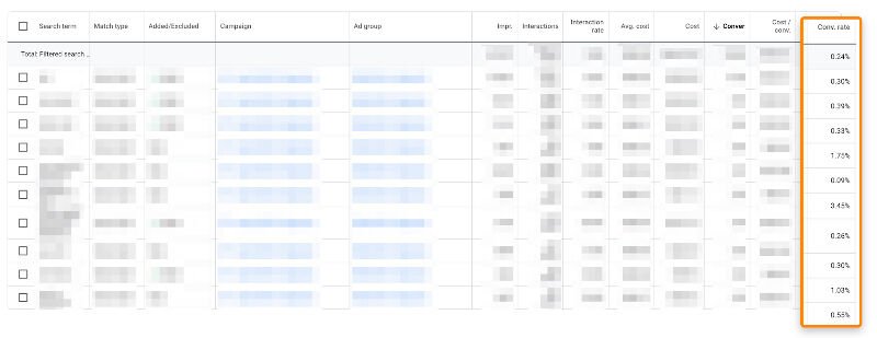 Reports in the “Search terms” section of Google Ads will show conversion data for keywords you’re bidding on.