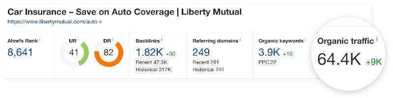 If we look at estimated organic traffic reports versus currently top-ranking pages for this keyword, we see that they get about 64,000 organic visits per month.